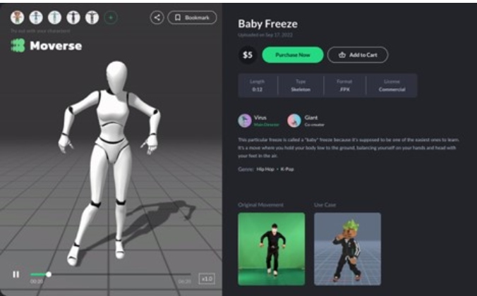 Moverse is a service providing 3D motion for the metaverse, virtual humans, and other digital markets, based on creator authentication. Combining KAIST graduates with entertainment content planning experts, it collaborates with various game companies and metaverse platforms to supply a wide range of motions that resolve copyright issues.